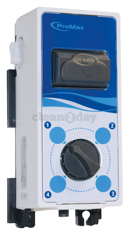 De PROMAX-afvulstations verdunnen automatisch een productconcentraat met water. Door de knop in te drukken vult u snel sprayflessen en andere reservoirs met kant-en-klaarproduct.