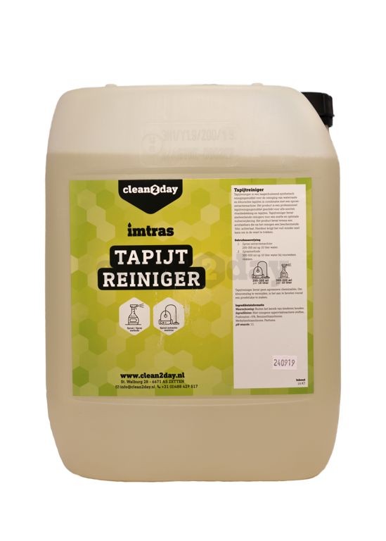 Imtras Tapijtreiniger is een laagschuimend synthetisch reinigingsmiddel voor het reinigen van watervaste en kleurechte tapijten in combinatie met een sproei-extractie machine. Tapijtreiniger is een professioneel tapijtreinigingsmiddel geschikt voor alle soorten vloerbedekking en tapijten. Imtras Tapijtreiniger bevat snelwerkende reinigers voor een snelle en optimale vuilverwijdering. Het bevat tevens een acrylaat hars, die na het reinigen een beschermende “film” achterlaat. Hierdoor krijgt het vuil minder snel kans om in de vezel te trekken.