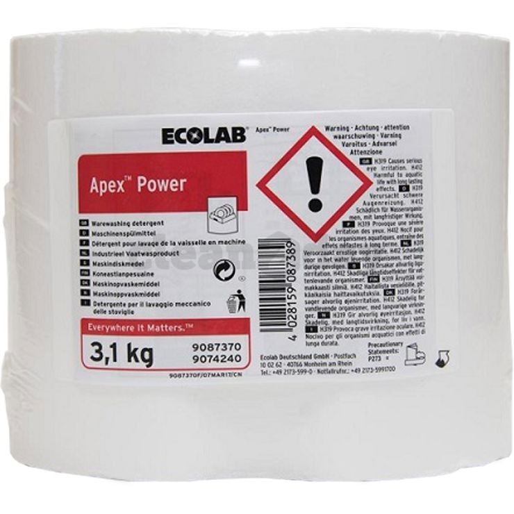 Vaatwasproduct in vaste vorm met chloor voor zacht tot medium hard water. Ecolab Apex Power is uitsluitend te gebruiken met het APEX doseersysteem voor APEX vaatwas detergenten.